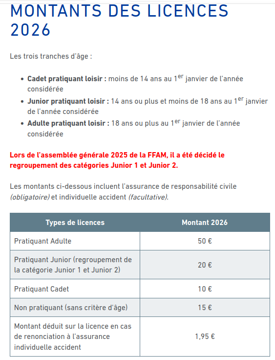 Vous retrouverez ci-dessous le tableau des tarifs de licence de la FFAM également accessible sur leur site, site FFAM